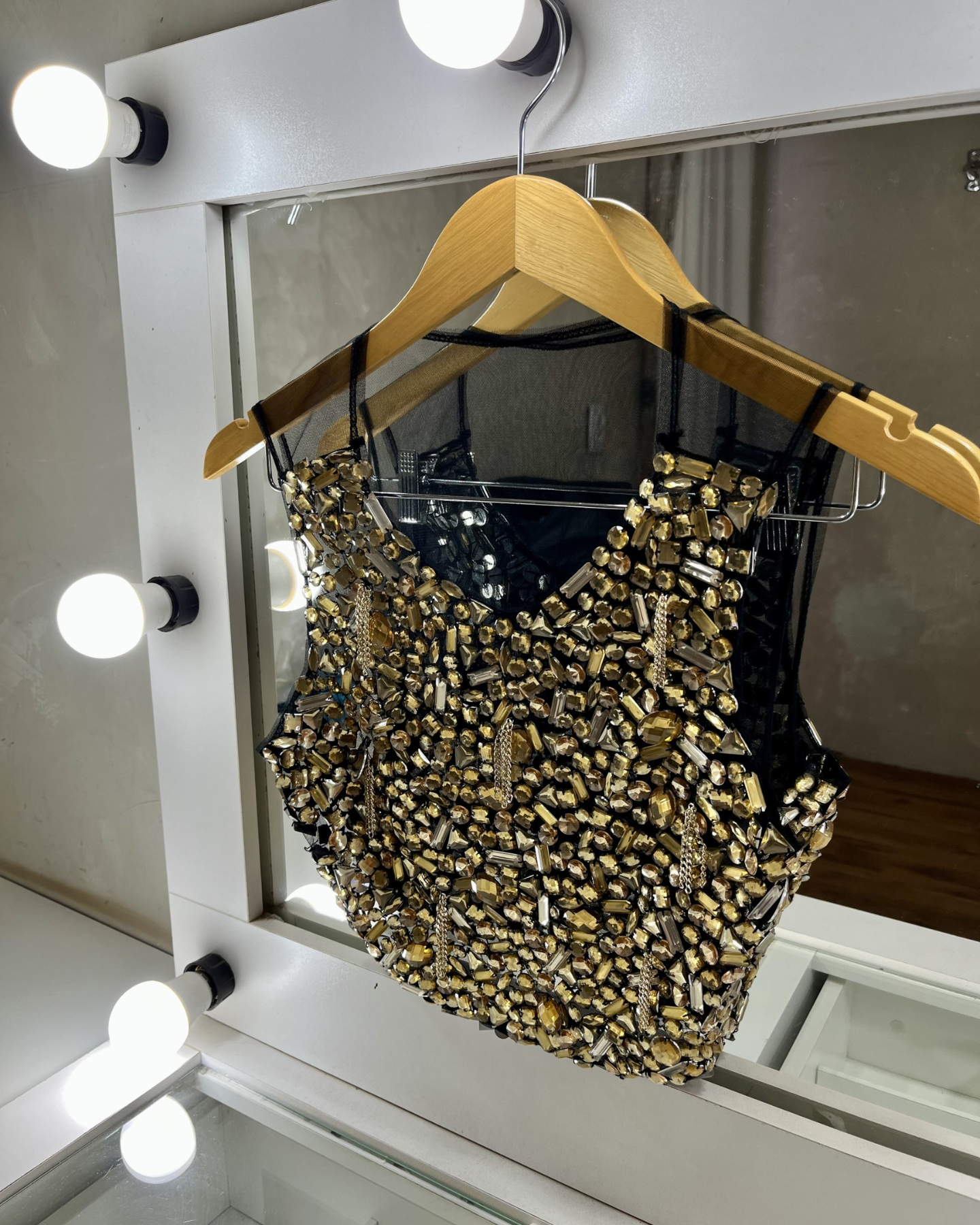 Cropped em tule com ziper na lateral. Bordado a mão em pedrarias e correntes.